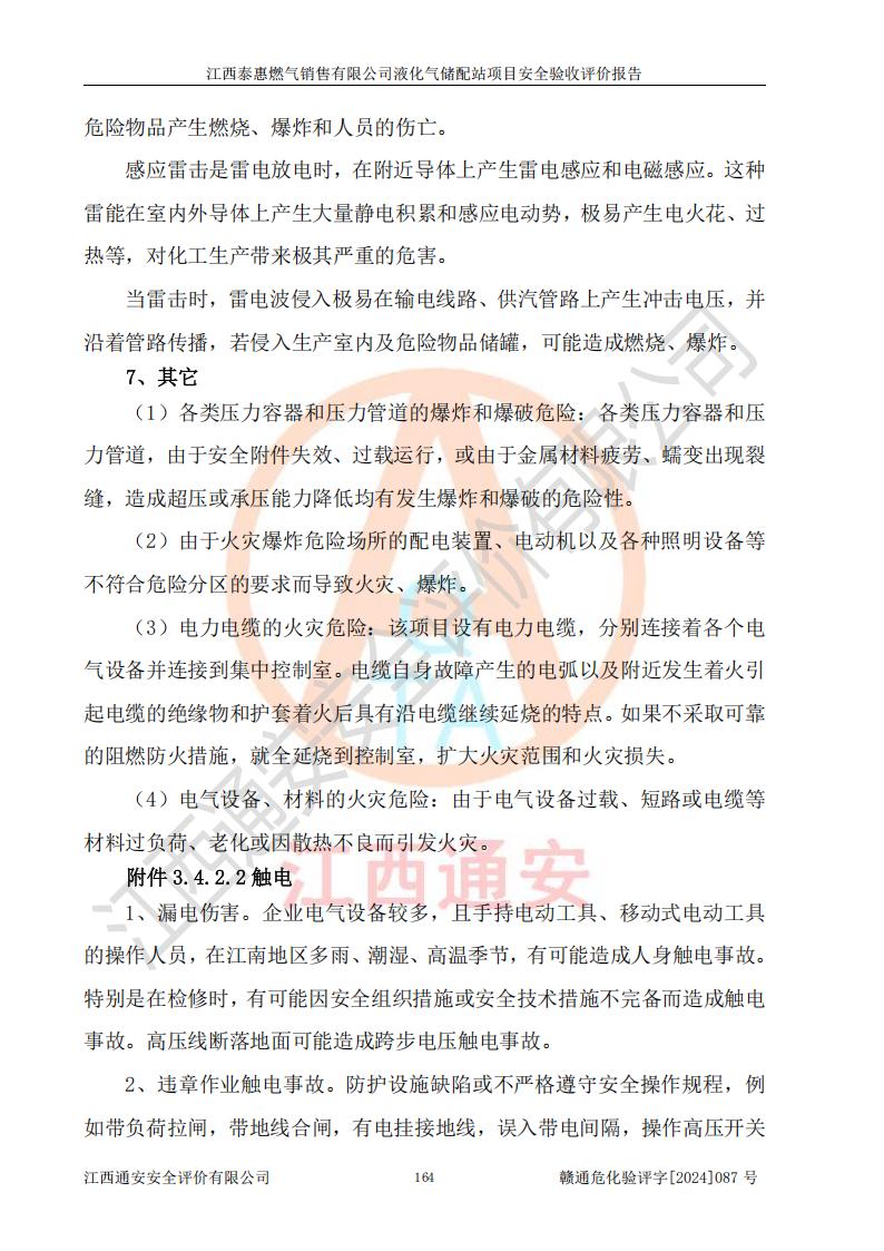 其它 | 在對該項目危險、有害因素辨識分析的基礎上,運用安全檢查表、預作業(yè)條件危險性分析法、危險度評價、重大事故后果分析結果等評價方法對該項目進行了分析評價,評價結果如下: 1、該項目位于江西省吉安市泰和縣澄江鎮(zhèn)黃崗村八組,符合當?shù)匾?guī)劃,與周邊環(huán)境的距離符合有關標準、規(guī)范的要求。 2、總圖布置分區(qū)明確,布局合理,各建構筑物的防火間距滿足規(guī)范要求。 3、該項目無**明令淘汰的工藝,設備、設施與工藝條件、內部介質相適應,特種設備及設施較齊全,按規(guī)定設置防雷、防靜電接地,爆炸危險環(huán)境加油機按要求采用防爆型,符合相關標準規(guī)范要求。 5、企業(yè)設置了安全生產管理機構,配備了專職安全生產管理人員,建立了安全生產責任制和安全生產管理制度,編制了崗位操作規(guī)程,編制了生產安全事故應急預案,人員經過相應的培訓,企業(yè)的安全生產管理正常。 6、作業(yè)條件危險性評價結果:在選定的評價單元中,作業(yè)危險程度均為“一般危險,需要注意”,作業(yè)條件相對安全。 7、危險度評價結果:儲罐區(qū)和槽車卸車區(qū)危險度為Ⅰ級,屬**危險,烴泵及壓縮機室、灌瓶間和瓶庫危險度為Ⅱ級,屬中度危險。 評價結論: 江西泰惠燃氣銷售有限公司液化氣儲配站項目的安全設施及安全管理符合**及有關部門關于安全生產法律、法規(guī)、標準的要求,安全風險是受控制的,其風險程度是可以接受的,符合安全生產條件,能夠滿足安全生產的要求,具備安全設施“三同時”驗收條件。 | ||||