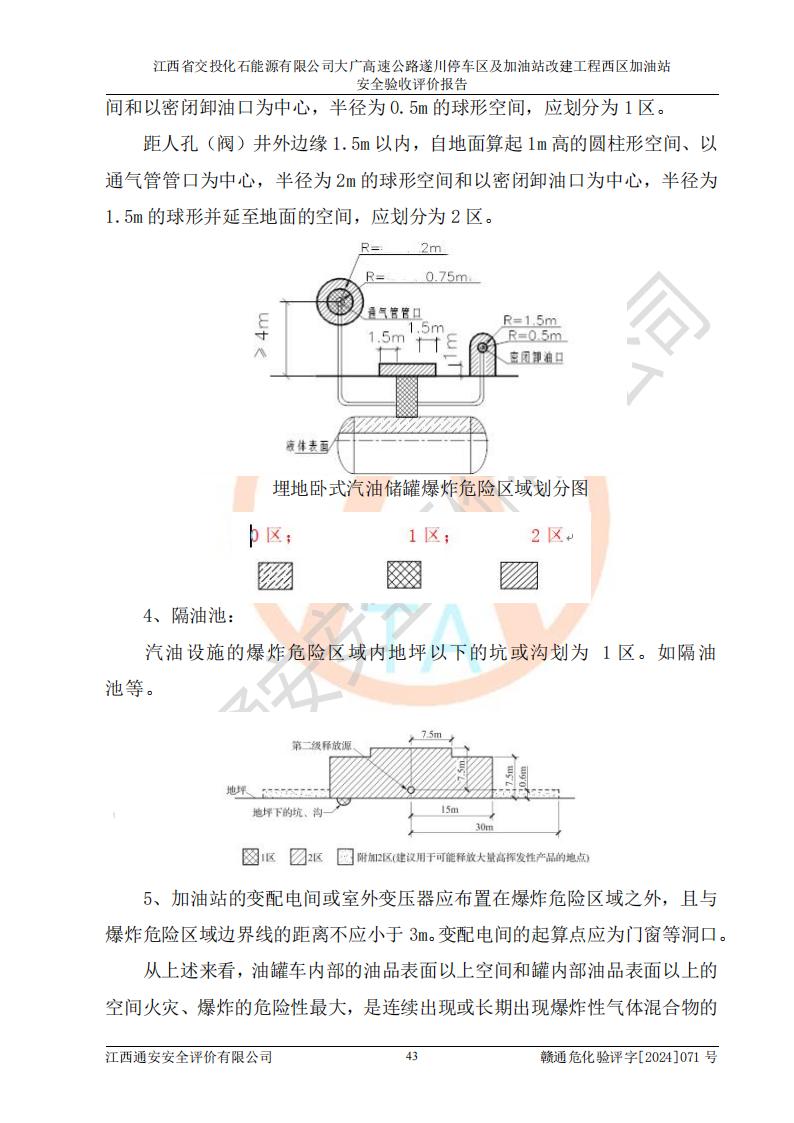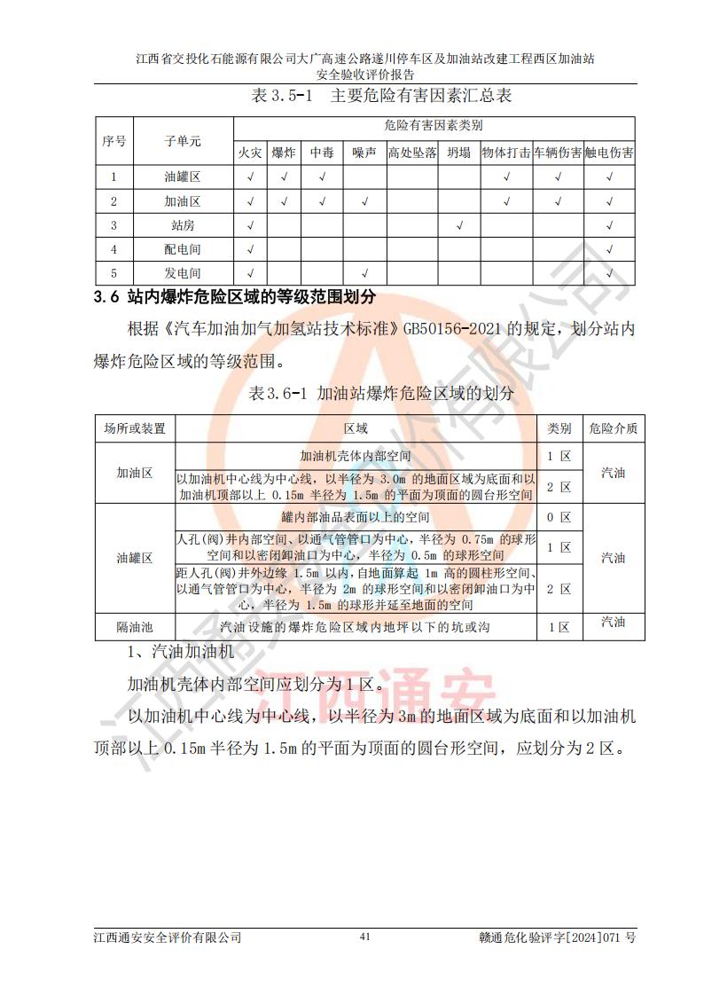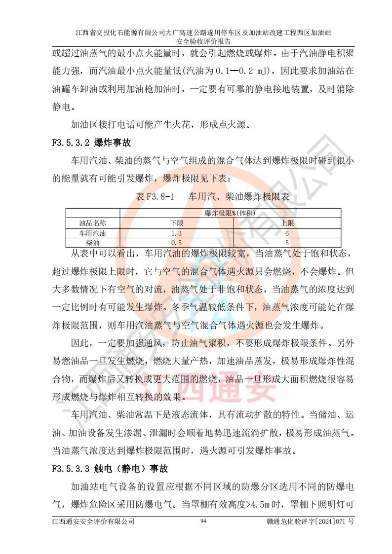 項目簡介 | 江西省交投化石能源有限公司成立于2023年6月13日,為江西省交通投資集團(tuán)有限責(zé)任公司子公司,企業(yè)類型:有限責(zé)任公司(非自然人投資或控股的法人獨資),法定**人:陳大學(xué)。經(jīng)營范圍為:許可項目:建設(shè)工程施工(除核電站建設(shè)經(jīng)營、民用機(jī)場建設(shè)),建設(shè)工程設(shè)計,建設(shè)工程勘察,建設(shè)工程施工(依法須經(jīng)批準(zhǔn)的項目,經(jīng)相關(guān)部門批準(zhǔn)后在許可**期內(nèi)方可開展經(jīng)營活動,具體經(jīng)營項目和許可期限以相關(guān)部門批準(zhǔn)文件或許可證件為準(zhǔn))一般項目:石油制品銷售(不含危險化學(xué)品),化工產(chǎn)品銷售(不含許可類化工產(chǎn)品),成品油批發(fā)(不含危險化學(xué)品),煉油、化工生產(chǎn)**設(shè)備銷售,非居住房地產(chǎn)租賃,住房租賃,租賃服務(wù)(不含許可類租賃服務(wù)),工程管理服務(wù),潤滑油銷售(除依法須經(jīng)批準(zhǔn)的項目外,憑營業(yè)執(zhí)照依法自主開展經(jīng)營活動)。該站位于江西省吉安市遂川縣碧洲鎮(zhèn)。 該加油站改建前為中國石化銷售股份有限公司江西吉安石油分公司遂川服務(wù)區(qū)高速西加油站。江西省交投化石能源有限公司收購了該加油站。 江西省交投化石能源有限公司大廣高速公路遂川停車區(qū)及加油站改建工程西區(qū)加油站位于江西省吉安市遂川縣碧洲鎮(zhèn),占地規(guī)模和建筑面積:總用地面積3024.38m2,建筑計容面積848.33m2;新建二層框架結(jié)構(gòu)站房418.89m2。新建一座鋼結(jié)構(gòu)罩棚,投影面積971.29m2,建筑面積429.44m2。 該加油站改建前站內(nèi)設(shè)置了1座50m3的0#柴油埋地臥式雙層貯罐、1座30m3的0#柴油埋地臥式雙層貯罐、1座30m3的92#汽油埋地臥式雙層貯罐、1座50m3的92#汽油埋地臥式油罐、1座50m3的95#汽油埋地臥式雙層油罐。*大存儲量為210m3,實際油品折算總?cè)萘繛?70m3(柴油折半),屬于**加油站。改建后站內(nèi)設(shè)置2座50m3油罐儲存0#柴油,1座50m3油罐儲存92#汽油,1座50m3油罐儲存95#汽油,1座30m3油罐儲存92#汽油,1座30m3油罐儲存98#汽油,*大存儲量為260m3,實際油品折合總?cè)萘抗灿?10m3(柴油折半計算),屬于**加油站。加油站等級未發(fā)生改變。 該加油站的主要化學(xué)品物質(zhì)是汽油和柴油。根據(jù)危險化學(xué)品目錄[2015年版]》(**安監(jiān)總局等十部門[2015]第5號)以及《應(yīng)急管理部辦公廳關(guān)于修改《危險化學(xué)品目錄(2015版)實施指南(試行)》涉及柴油部分內(nèi)容的通知》(應(yīng)急廳函〔2022〕300號)、應(yīng)急管理部 工業(yè)和信息化部 公安部 生態(tài)環(huán)境部 交通運輸部 農(nóng)業(yè)農(nóng)村部 衛(wèi)生健康委 市場監(jiān)管總局 鐵路局 民航局公告2022年第8號決定調(diào)整《危險化學(xué)品目錄(2015版)》,將“1674柴油[閉杯閃點≤60℃]”調(diào)整為“1674柴油”等文件進(jìn)行辨識:該加油站經(jīng)營的汽油、柴油均屬于危險化學(xué)品。 | |||