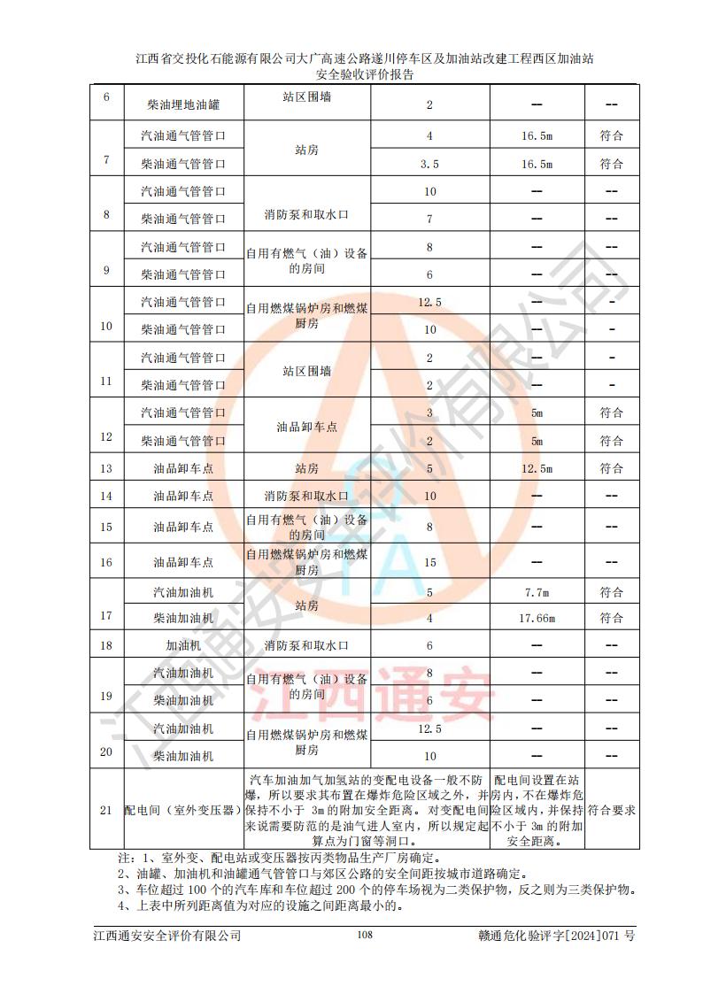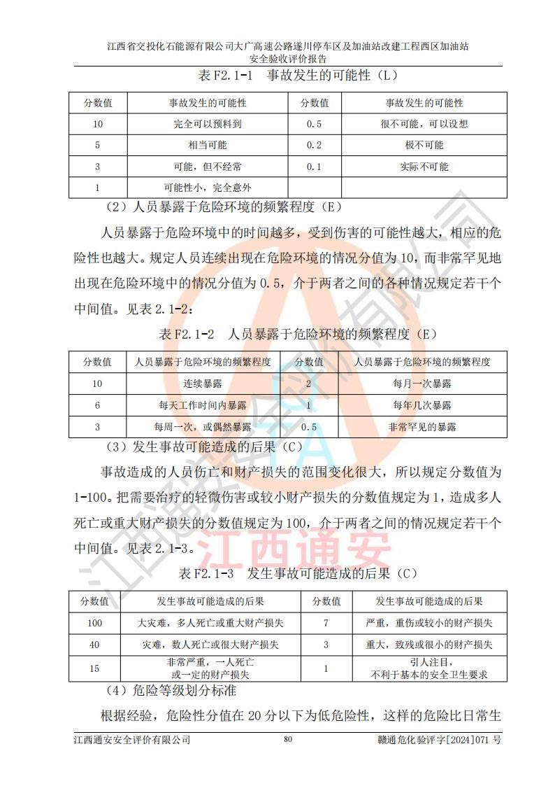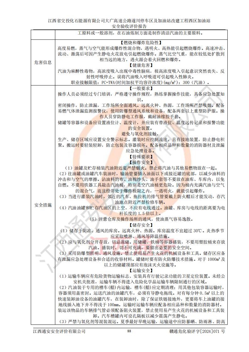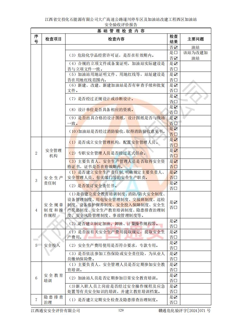 評價結(jié)論 | 該加油站在設(shè)計、施工過程中符合《危險化學(xué)品建設(shè)項目安全監(jiān)督管理辦法》(2012年1月30日**安全生產(chǎn)監(jiān)督管理總局令第45號公布,自2012年4月1日起施行;根據(jù)2015年5月27日**安全生產(chǎn)監(jiān)督管理總局令第79號修正)等法規(guī)的要求,工程配套的安全設(shè)施做到了與主體工程同時設(shè)計、同時施工、同時投入生產(chǎn)和使用,符合**有關(guān)建設(shè)項目“三同時”的規(guī)定和要求。 該加油站現(xiàn)場情況與竣工圖紙一致,主體工程安全設(shè)施、安全措施符合法律法規(guī)的規(guī)定和要求,安全設(shè)施正常投用并運行**;公用工程及輔助設(shè)施滿足主體工程生產(chǎn)安全的需要;企業(yè)安全管理體系滿足生產(chǎn)安全的要求。該加油站與周邊裝置和設(shè)施的安全防護(hù)距離、安全設(shè)施滿足標(biāo)準(zhǔn)規(guī)范的要求,該加油站的安全條件滿足安全生產(chǎn)的要求。 該加油站已針對本報告提出的安全隱患整改意見組織人員進(jìn)行整改,已落實到位,企業(yè)安全生產(chǎn)的風(fēng)險控制在可以接受的范圍內(nèi)。 綜上所述,江西省交投化石能源有限公司大廣高速公路遂川停車區(qū)及加油站改建工程西區(qū)加油站具備**有關(guān)安全生產(chǎn)法律、法規(guī)、部門規(guī)章及標(biāo)準(zhǔn)規(guī)范要求的安全條件,符合經(jīng)營和儲存危險化學(xué)品的安全條件要求,具備安全驗收的要求。 | |||