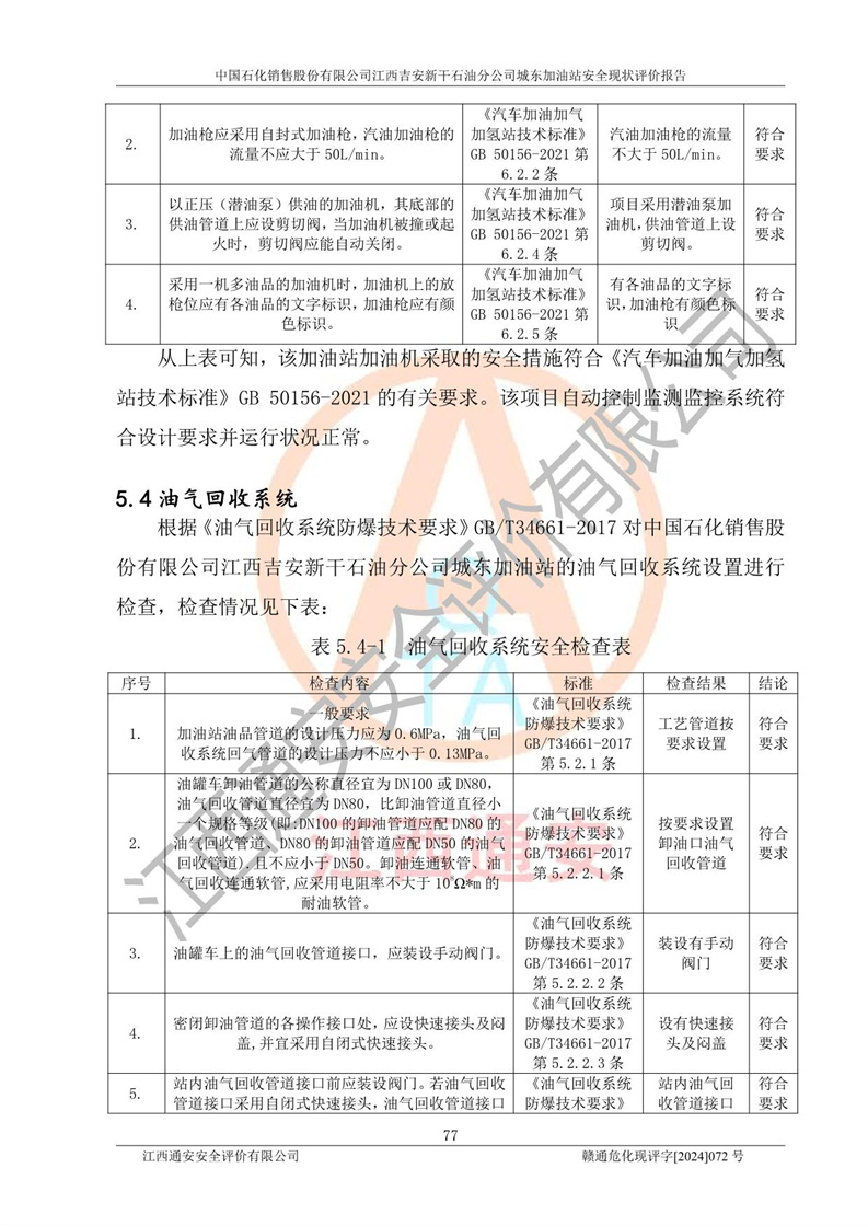 評價結(jié)論 | 中國石化銷售股份有限公司江西吉安新干石油分公司城東加油站符合《汽車加油加氣加氫站技術(shù)標(biāo)準(zhǔn)》GB50156-2021等標(biāo)準(zhǔn)規(guī)范的要求,安全風(fēng)險可控,滿足危險化學(xué)品經(jīng)營的安全條件。 | |||