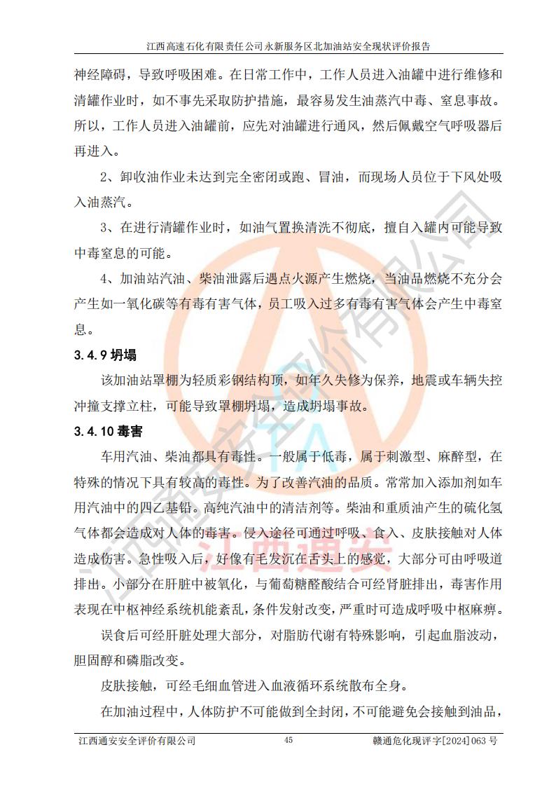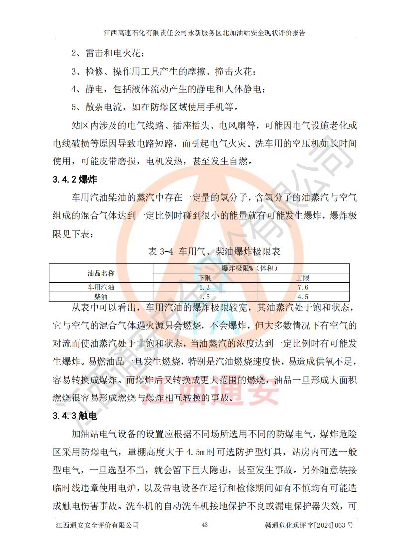 項目簡介 | 江西高速石化有限責任公司永新服務區(qū)北加油站成立于2019年2月2日,類型:其他有限責任公司分公司;負責人:陳志斌;經營場所為江西省吉安市永新縣吉蓮高速永新服務區(qū)北。該公司營業(yè)執(zhí)照經營范圍:石油、石油化工、化纖及其他化工產品的銷售;光伏、充電樁、日用百貨便利店經營:汽車清洗服務:廣告位出租:房屋租賃:食品、計生用品、零售卷煙、雪茄煙:委托代理收取水電費:銷售潤滑油、燃油料。(依法須經批準的項目,經相關部門批準后方可開展經營活動)。 江西高速石化有限責任公司永新服務區(qū)北加油站設有1臺92#汽油/92#汽油/95#汽油/0#柴油/92#汽油/95#汽油6槍3油品加油機,1臺0#柴油/92#汽油/95#汽油/0#柴油/92#汽油/95#汽油6槍3油品加油機,1臺92#汽油/92#汽油/95#汽油/92#汽油/92#汽油/95#汽油6槍雙油品加油機,設1個尿素加注機(防爆,按柴油加油機確認);設2臺50m3的92#汽油雙層埋地儲罐;1臺50m3的95#汽油雙層埋地儲罐;1臺50m3的0#柴油雙層埋地儲罐;*大總儲量為200m3,柴油折半后總容積為175m3,加油站等級為一級,汽油卸油、加油設置了油氣回收系統(tǒng)。 該加油站的主要化學品物質是汽油和柴油。根據危險化學品目錄[2015年版]》(**安監(jiān)總局等十部門[2015]第5號)以及《應急管理部辦公廳關于修改《危險化學品目錄(2015版)實施指南(試行)》涉及柴油部分內容的通知》(應急廳函〔2022〕300號)、應急管理部 工業(yè)和信息化部 公安部 生態(tài)環(huán)境部 交通運輸部 農業(yè)農村部 衛(wèi)生健康委 市場監(jiān)管總局 鐵路局 民航局公告2022年第8號決定調整《危險化學品目錄(2015版)》,將“1674柴油[閉杯閃點≤60℃]”調整為“1674柴油”等文件進行辨識:該加油站經營的汽油、柴油均屬于危險化學品。 | |||