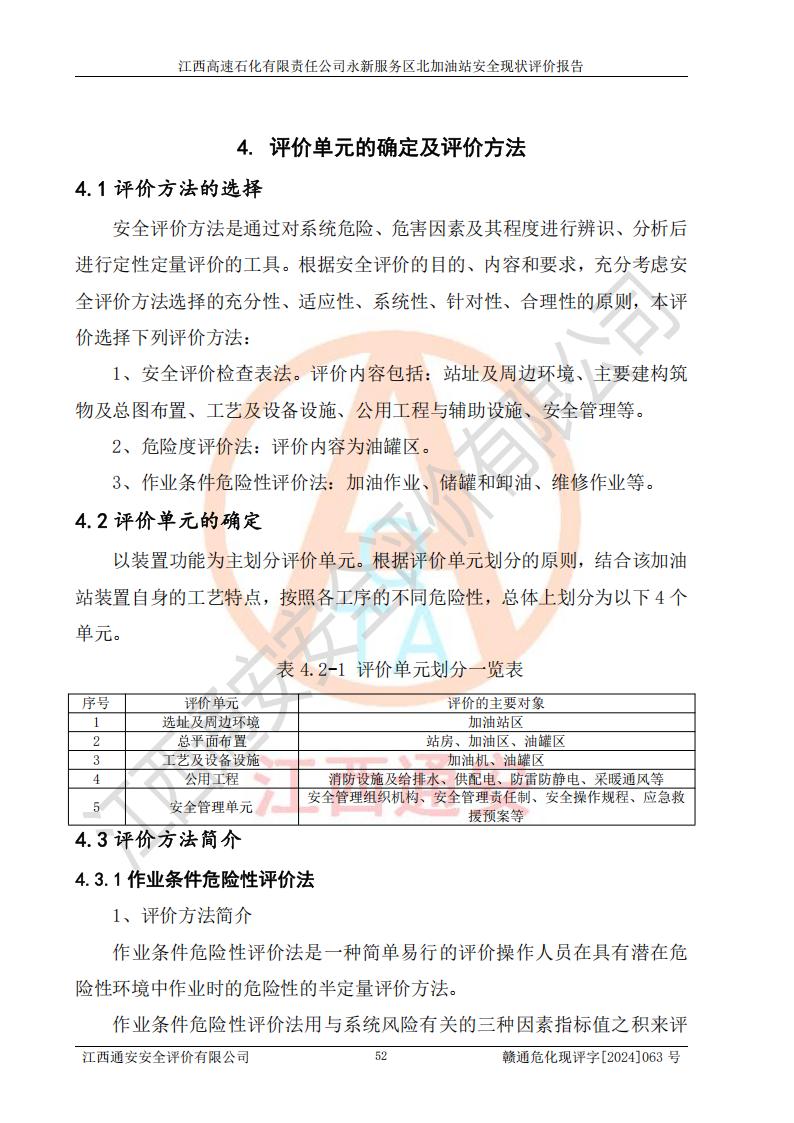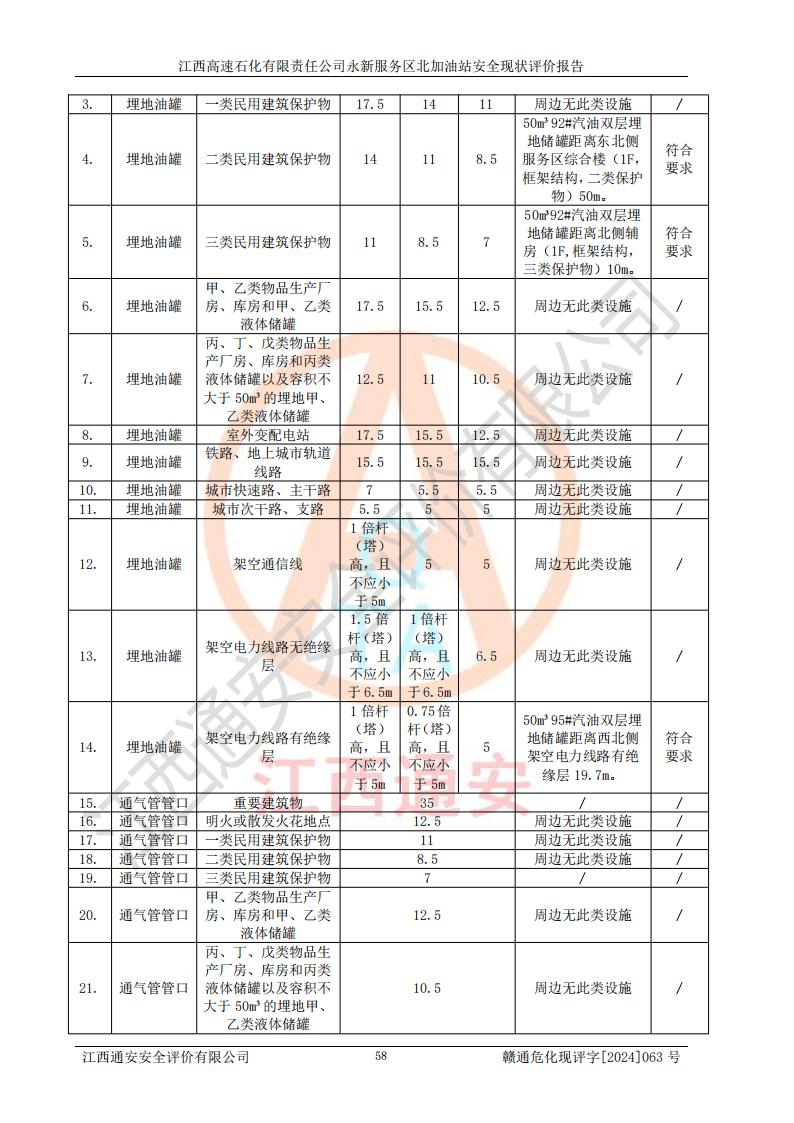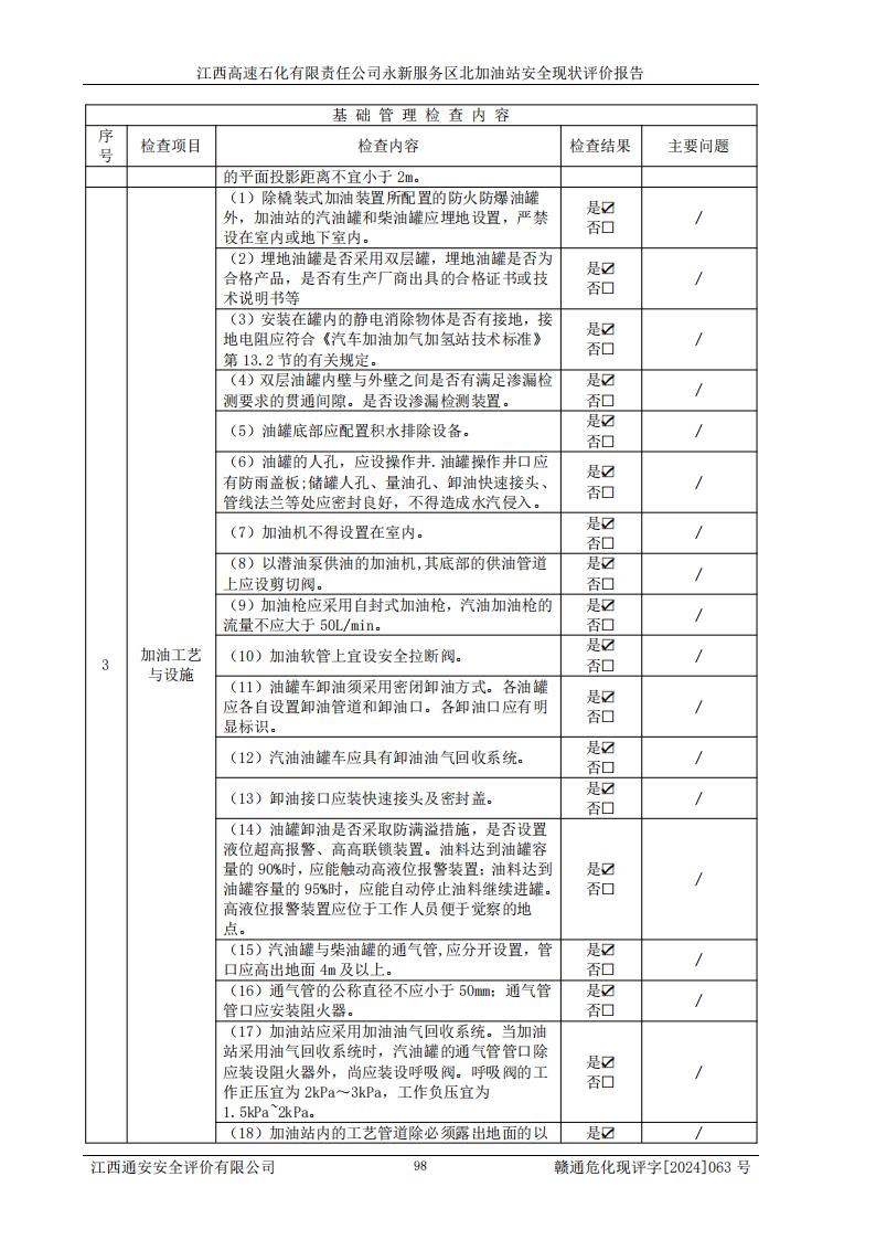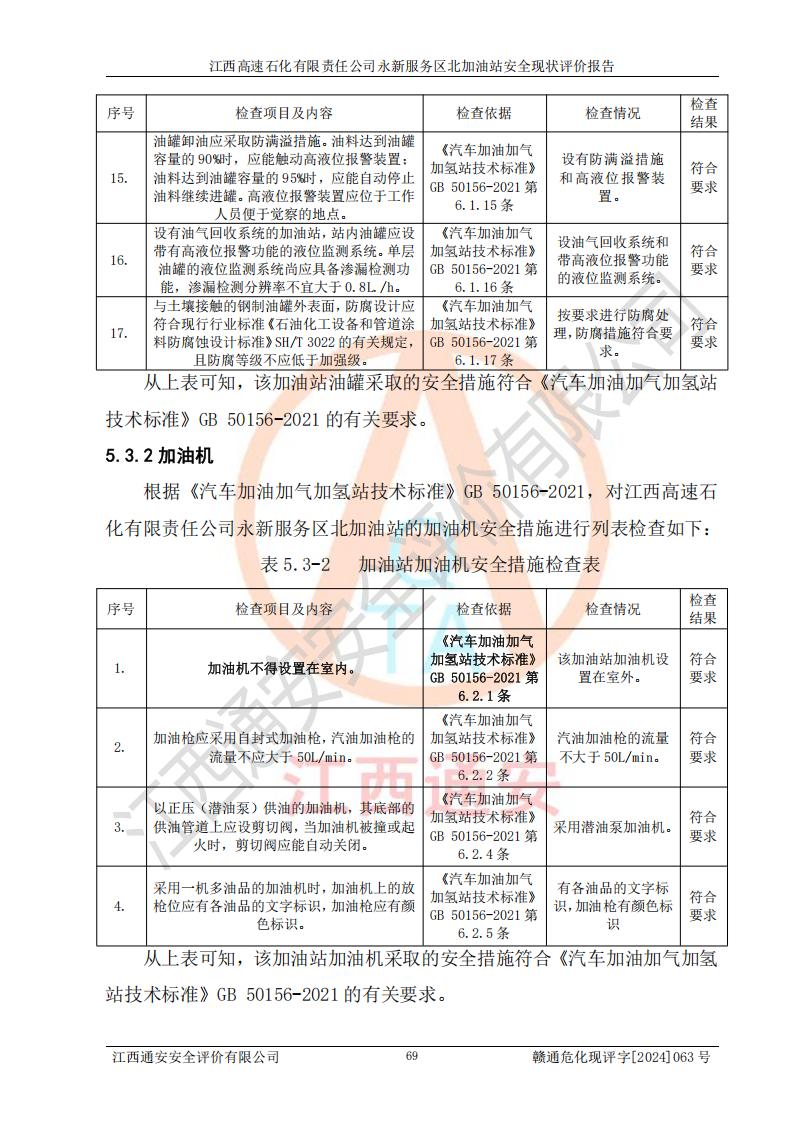 評價結論 | 江西高速石化有限責任公司永新服務區(qū)北加油站站址合理,周邊環(huán)境良好,與敏感防護目標間距符合規(guī)范要求,站區(qū)建構筑物之間的防火間距、耐火等級符合標準要求,與總平面布置圖一致,加油卸油工藝及設備設施合理,工藝布置得當,防雷設施經檢測合格,采取的工藝安全設施符合規(guī)范要求;該加油站制定了安全管理制度和操作規(guī)程,人員經培訓合格后上崗,安全管理人員經考核合格并取得安全合格證,能按照法律法規(guī)要求開展安全生產管理工作。 綜上:江西高速石化有限責任公司永新服務區(qū)北加油站符合《汽車加油加氣加氫站技術標準》GB50156-2021等標準規(guī)范的要求,安全風險可控,滿足危險化學品經營的安全條件。 | |||