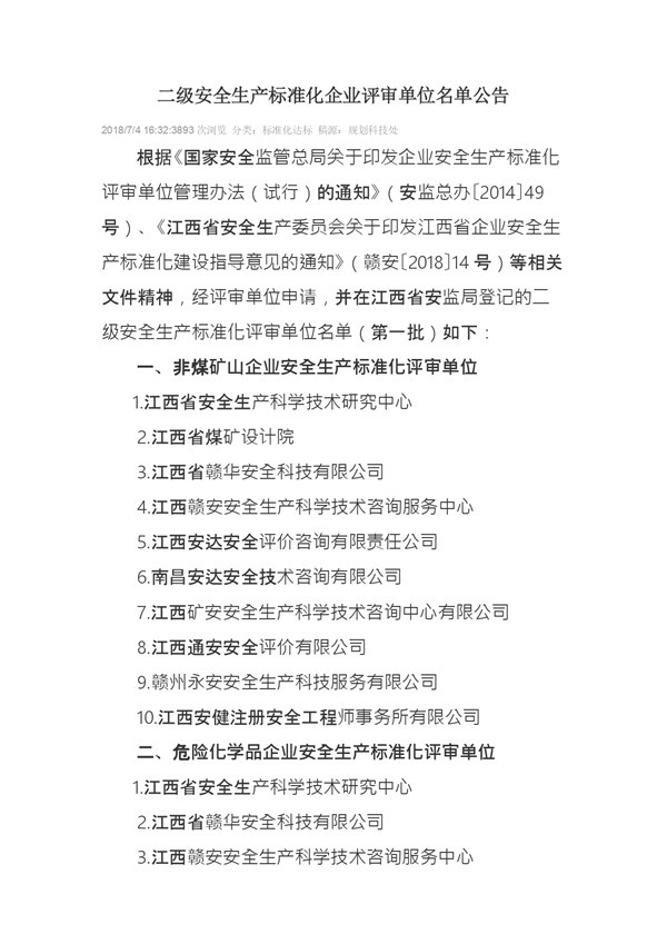 二級安全生產(chǎn)標準化企業(yè)評審單位名單公告
